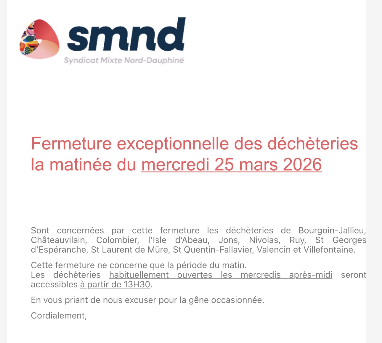 La commune informe ses habitants que, suite à une communication du Syndicat Mixte Nord-Dauphiné (SMND), les déchèteries du territoire seront exceptionnellement fermées la matinée du mercredi 25 mars 2026.