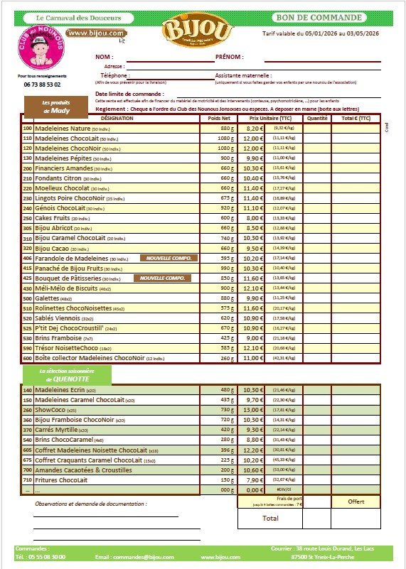 Commande de Madeleines BIJOU auprès du club des Nounous Jonsoises