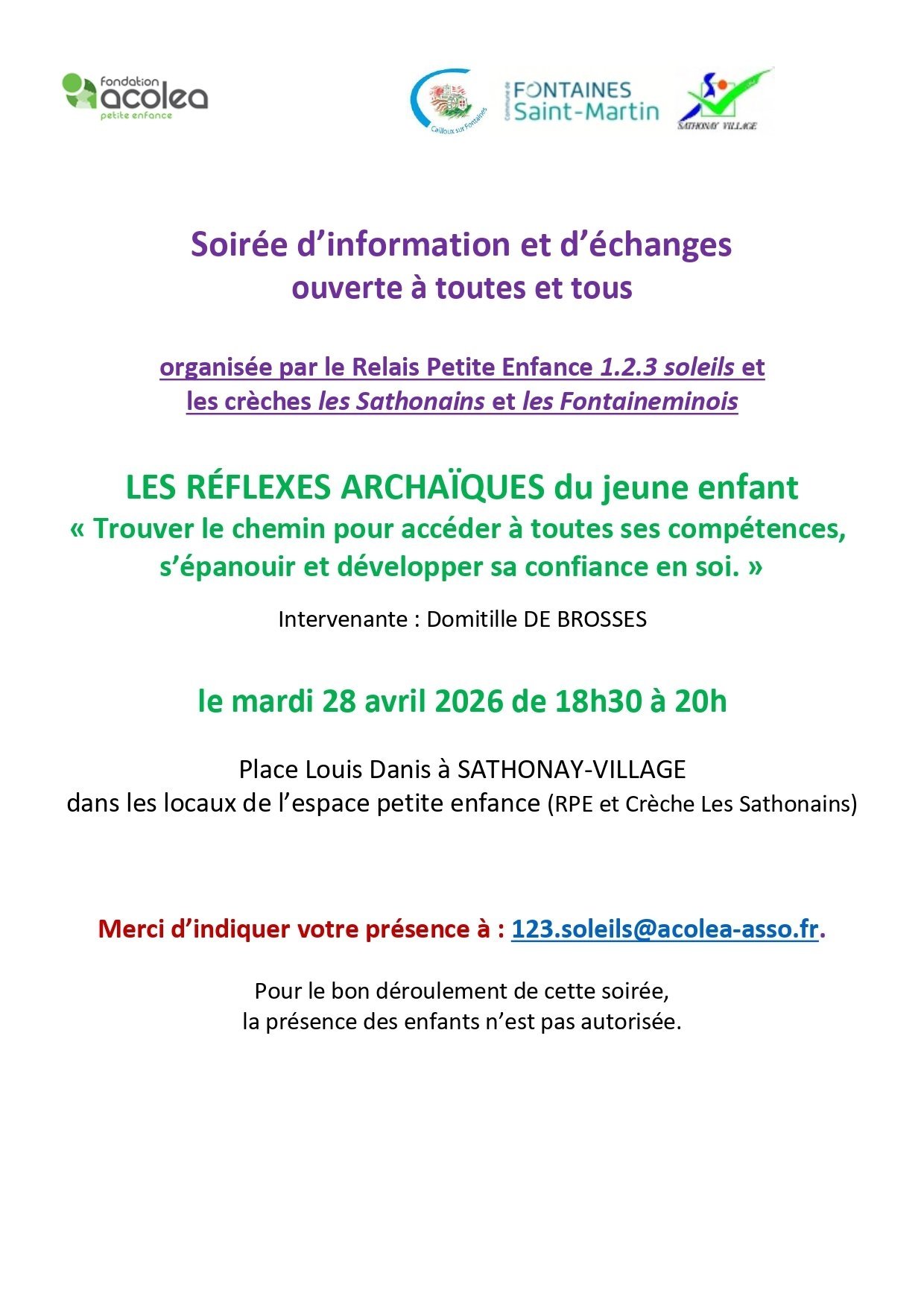 Les structures de la petite enfance de l’Entente Intercommunale organise un événement qui se déroulera le mardi 28 avril prochain consacré aux REFLEXES ARCHAIQUES à Sathonay-Village de 18h30 à 20h00.